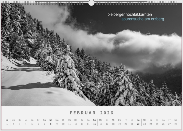 Dezember: Glück Auf! gilt heute noch ein üblicher Gruß im Bleibergertal. Das Hochtal wurde geprägt durch den Bergbau (Blei- und Zinkabbau). Die Bleiberger Bergwerks Union wurde 1867 gegründet, der Ursprung des Bergbaues liegt im 13. Jahrhundert. Am 1. Oktober 1993 wird nach 700-jährger Bergbautätigkeit der Bergbau in Bad Bleiberg geschlossen (Info: Bergmännischer Kulturverein Bad Bleiberg).