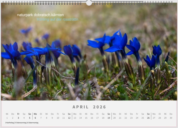 April: Der Frühlingsenzian wird auch „Schusternagel“ genannt und ist eine Pflanzenart der Gattung Enziane innerhalb der Familie der Enziangewächse. Die Blütezeit liegt zwischen März und August und der Frühlingsenzian blüht oft im Herbst ein zweites Mal. Am Weg zum Dobratsch, wie hier von Heiligengeist kommend, kann man die blauen Teppiche nicht übersehen.