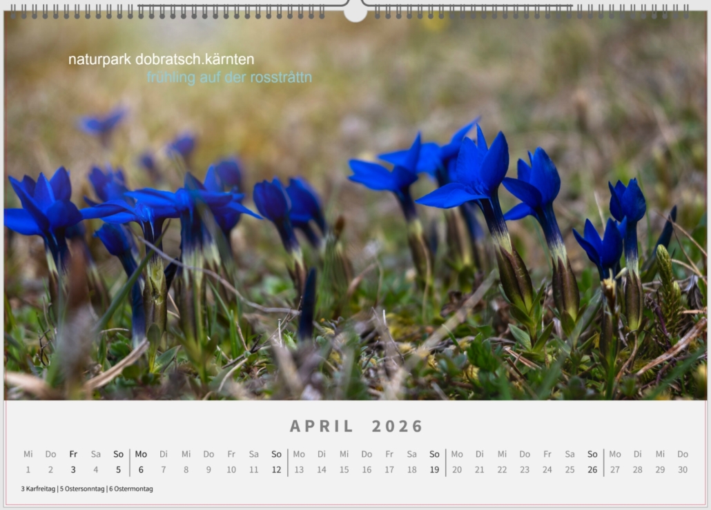 April: Der Frühlingsenzian wird auch „Schusternagel“ genannt und ist eine Pflanzenart der Gattung Enziane innerhalb der Familie der Enziangewächse. Die Blütezeit liegt zwischen März und August und der Frühlingsenzian blüht oft im Herbst ein zweites Mal. Am Weg zum Dobratsch, wie hier von Heiligengeist kommend, kann man die blauen Teppiche nicht übersehen.