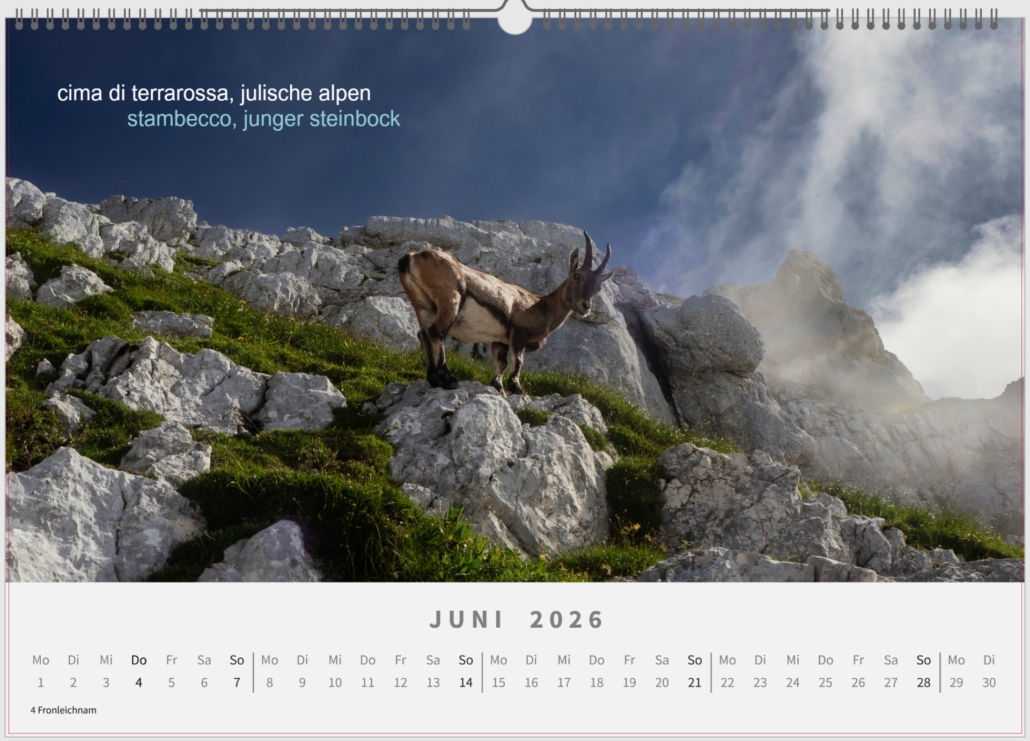 Juni: Die jungen Steinböcke am Weg zur Cima di Terrarossa sind an die Wanderer gewöhnt. Sie zeigen wenig Scheu und steigen in den felsigen Abhängen des Montasio-Gebirges umher. Vorsicht ist geboten, wenn sie Steine abtreten und immer für gefährliche Situationen sorgen können.