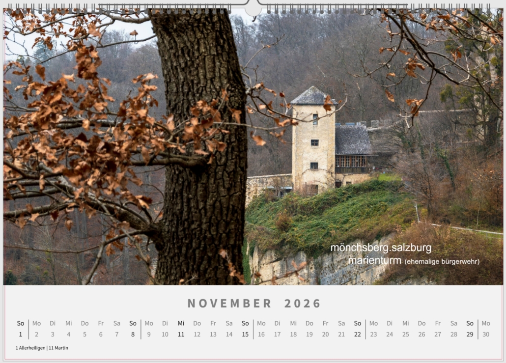 November: Die Bürgerwehr ist eine historische Befestigungsanlage auf dem Mönchsberg in Salzburg. Sie stammt in wesentlichen Teilen aus der Zeit der zweiten Stadtbefestigung (etwa 1465–1480) und trennt den Mönchsberg in einen sogenannten inneren und einen äußeren Teil. Sie gehört der Stadt Salzburg. Wegen der ersten Bauernunruhen, wegen der zunehmenden Türkengefahr wurde der so genannte Marienturm (Teil einer Befestigungsanlage) gebaut.