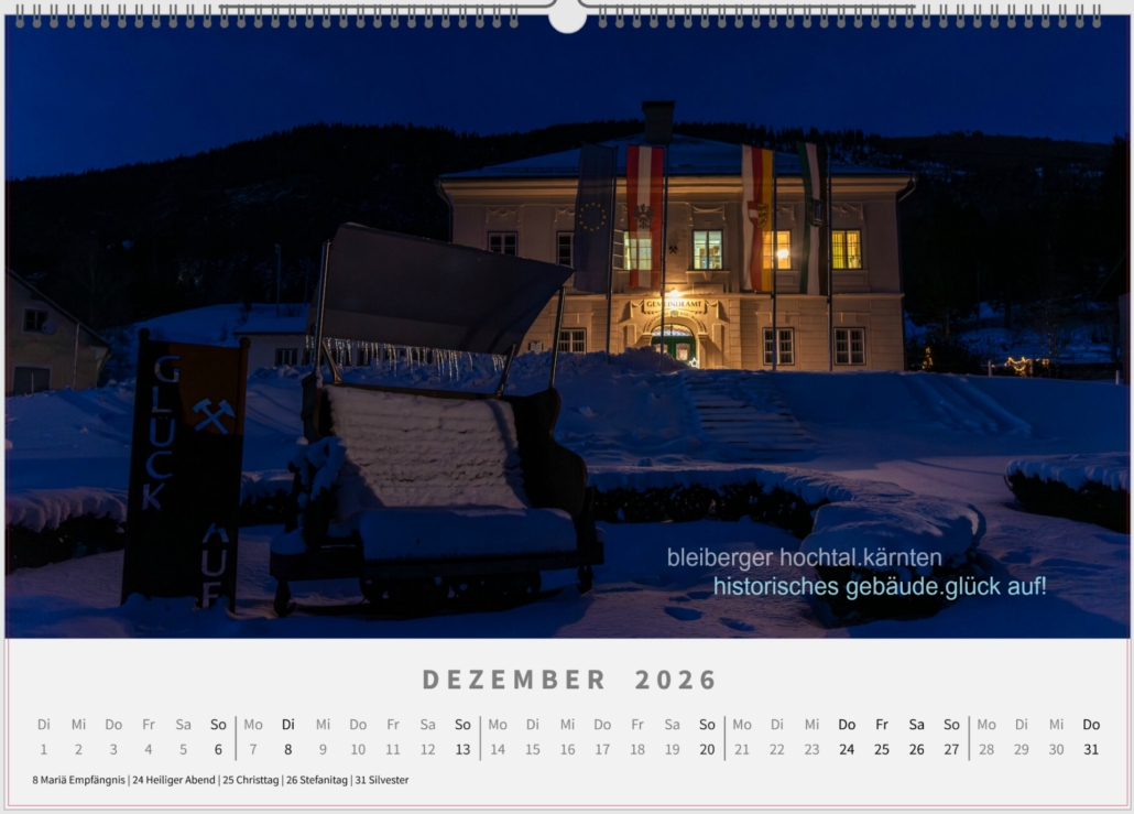 Dezember: Glück Auf! gilt heute noch ein üblicher Gruß im Bleibergertal. Das Hochtal wurde geprägt durch den Bergbau (Blei- und Zinkabbau). Die Bleiberger Bergwerks Union wurde 1867 gegründet, der Ursprung des Bergbaues liegt im 13. Jahrhundert. Am 1. Oktober 1993 wird nach 700-jährger Bergbautätigkeit der Bergbau in Bad Bleiberg geschlossen (Info: Bergmännischer Kulturverein Bad Bleiberg).