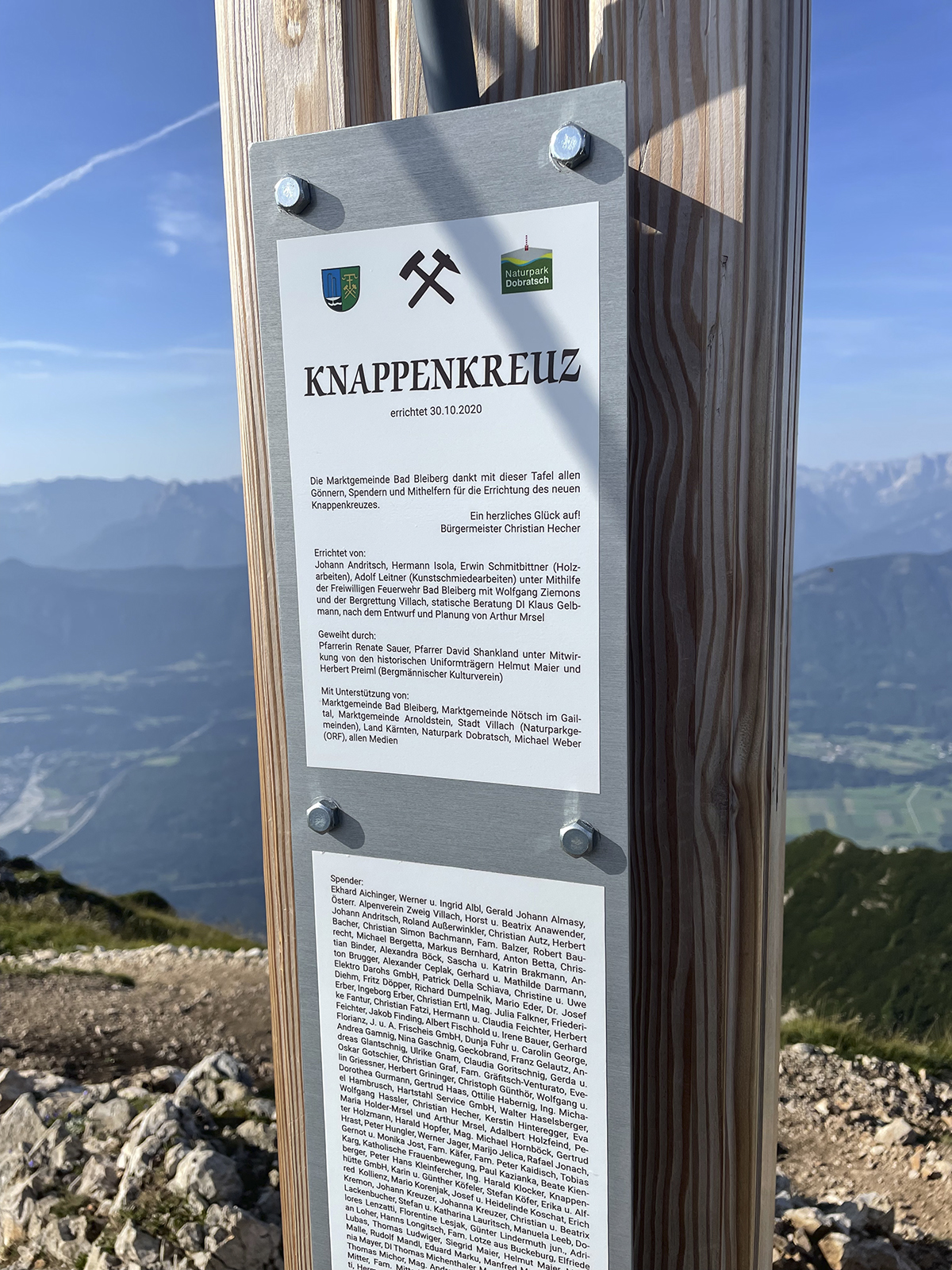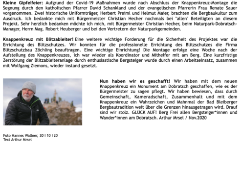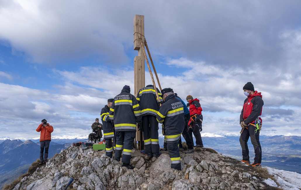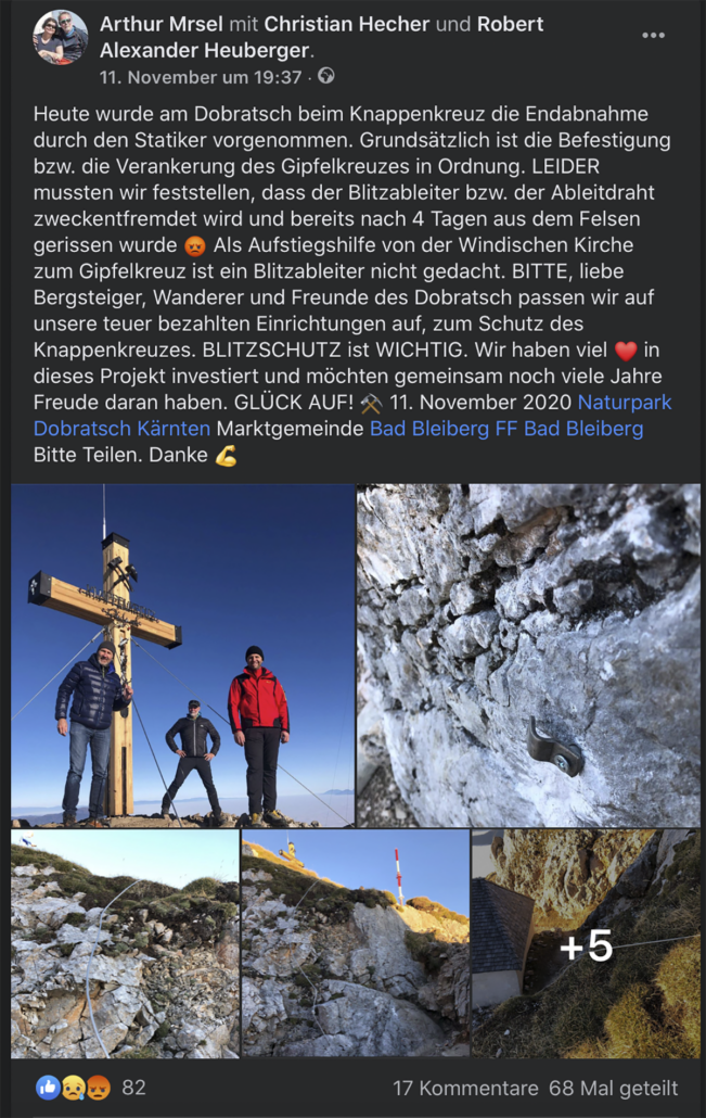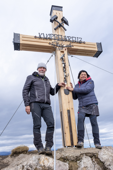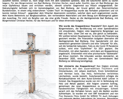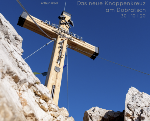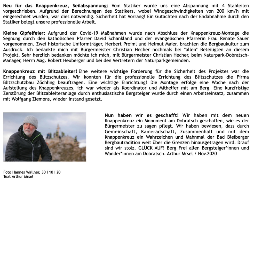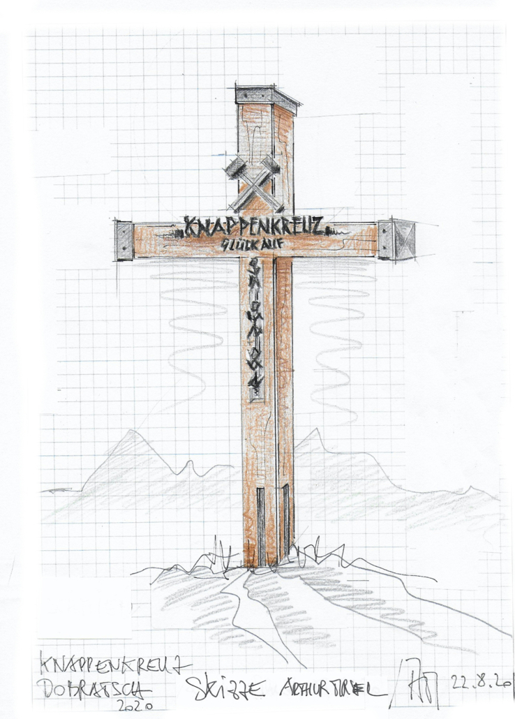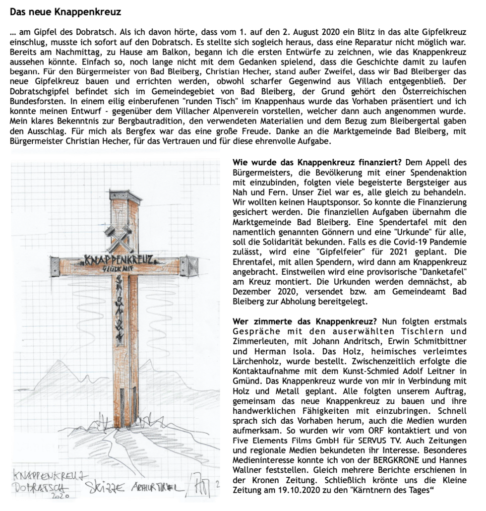 30.10.2020. Das neue Knappenkreuz am Gipfel des Dobratsch…… Als ich davon hörte, dass vom 1. auf den 2. August 2020 ein Blitz in das alte Gipfelkreuz einschlug, musste ich sofort auf den Dobratsch. Es stellte sich sogleich heraus, dass eine Reparatur nicht möglich war. Bereits am Nachmittag, zu Hause am Balkon, begann ich die ersten Entwürfe zu zeichnen, wie das Knappenkreuz aussehen könnte. Einfach so, noch lange nicht mit dem Gedanken spielend, dass die Geschichte damit zu laufen begann. Für den Bürgermeister von Bad Bleiberg, Christian Hecher, stand außer Zweifel, dass wir Bad Bleiberger das neue Gipfelkreuz bauen und errichten werden, obwohl scharfer Gegenwind aus Villach entgegenbließ. Der Dobratschgipfel befindet sich im Gemeindegebiet von Bad Bleiberg, der Grund gehört den Österreichischen Bundesforsten. In einem eilig einberufenen „runden Tisch“ im Knappenhaus wurde das Vorhaben präsentiert und ich konnte meinen Entwurf – gegenüber dem Villacher Alpenverein vorstellen, welcher dann auch angenommen wurde. Mein klares Bekenntnis zur Bergbautradition, den verwendeten Materialien und dem Bezug zum Bleibergertal gaben den Ausschlag. Für mich als Bergfex war das eine große Freude. Danke an die Marktgemeinde Bad Bleiberg, mit Bürgermeister Christian Hecher, für das Vertrauen und für diese ehrenvolle Aufgabe.