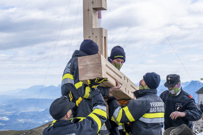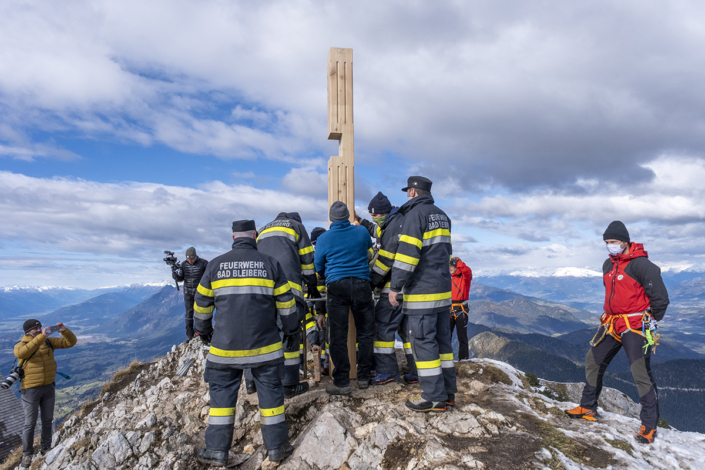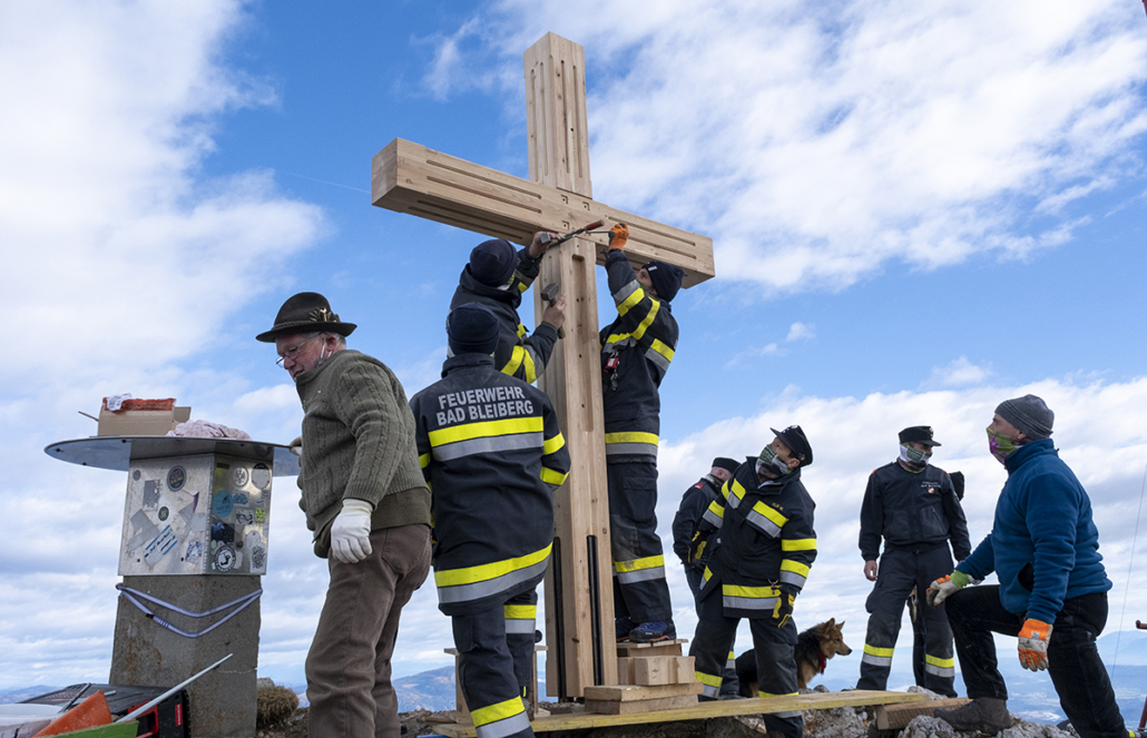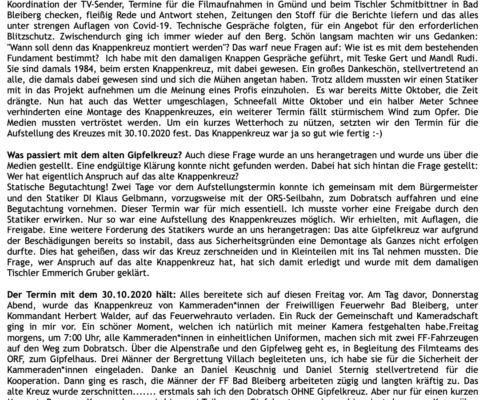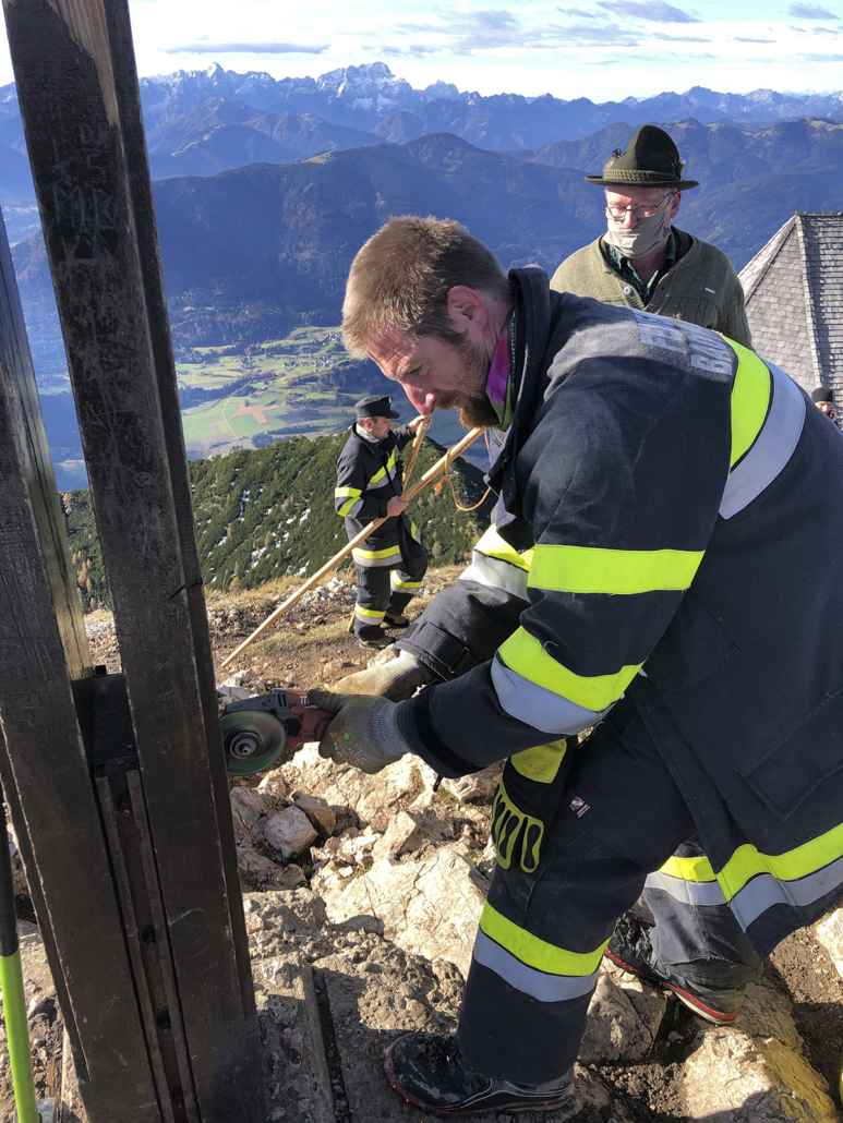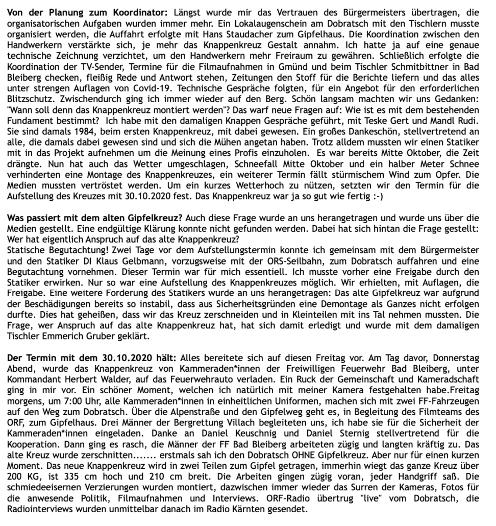 Von der Planung zum Koordinator: Längst wurde mir das Vertrauen des Bürgermeisters übertragen, die organisatorischen Aufgaben wurden immer mehr. Ein Lokalaugenschein am Dobratsch mit den Tischlern musste organisiert werden, die Auffahrt erfolgte mit Hans Staudacher zum Gipfelhaus. Die Koordination zwischen den Handwerkern verstärkte sich, je mehr das Knappenkreuz Gestalt annahm. Ich hatte ja auf eine genaue technische Zeichnung verzichtet, um den Handwerkern mehr Freiraum zu gewähren. Schließlich erfolgte die Koordination der TV-Sender, Termine für die Filmaufnahmen in Gmünd und beim Tischler Schmitbittner in Bad Bleiberg checken, fleißig Rede und Antwort stehen, Zeitungen den Stoff für die Berichte liefern und das alles unter strengen Auflagen von Covid-19. Technische Gespräche folgten, für ein Angebot für den erforderlichen Blitzschutz. Zwischendurch ging ich immer wieder auf den Berg. Schön langsam machten wir uns Gedanken: „Wann soll denn das Knappenkreuz montiert werden“? Das warf neue Fragen auf: Wie ist es mit dem bestehenden Fundament bestimmt? Ich habe mit den damaligen Knappen Gespräche geführt, mit Teske Gert und Mandl Rudi. Sie sind damals 1984, beim ersten Knappenkreuz, mit dabei gewesen. Ein großes Dankeschön, stellvertretend an alle, die damals dabei gewesen sind und sich die Mühen angetan haben. Trotz alldem mussten wir einen Statiker mit in das Projekt aufnehmen, um die Meinung eines Profis einzuholen.