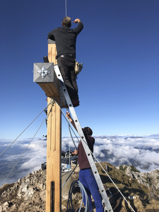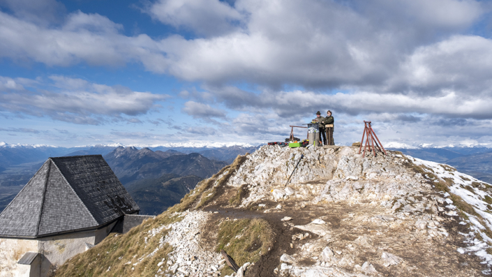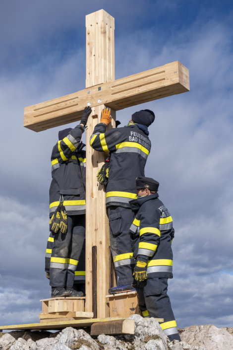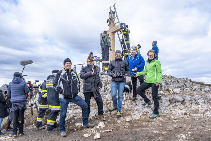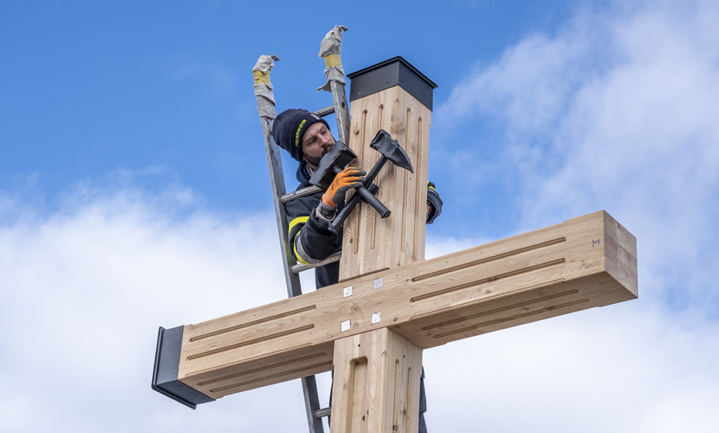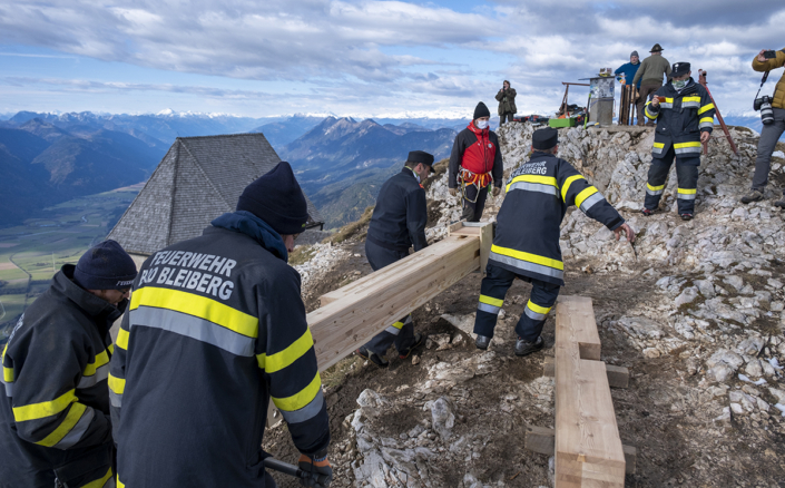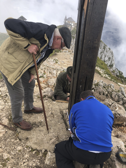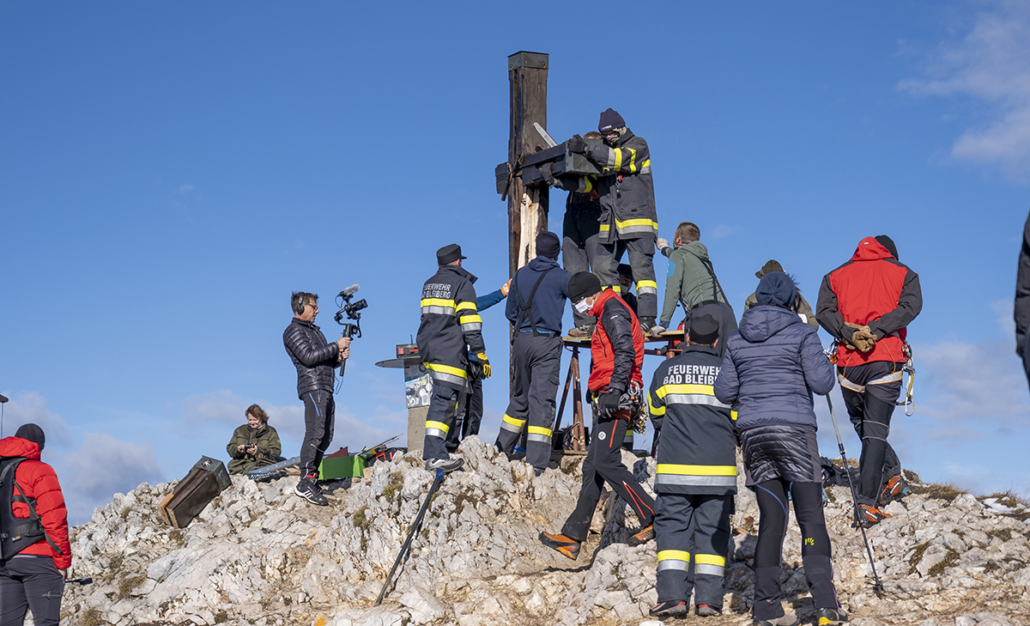 Von der Planung zum Koordinator: Längst wurde mir das Vertrauen des Bürgermeisters übertragen, die organisatorischen Aufgaben wurden immer mehr. Ein Lokalaugenschein am Dobratsch mit den Tischlern musste organisiert werden, die Auffahrt erfolgte mit Hans Staudacher zum Gipfelhaus. Die Koordination zwischen den Handwerkern verstärkte sich, je mehr das Knappenkreuz Gestalt annahm. Ich hatte ja auf eine genaue technische Zeichnung verzichtet, um den Handwerkern mehr Freiraum zu gewähren. Schließlich erfolgte die Koordination der TV-Sender, Termine für die Filmaufnahmen in Gmünd und beim Tischler Schmitbittner in Bad Bleiberg checken, fleißig Rede und Antwort stehen, Zeitungen den Stoff für die Berichte liefern und das alles unter strengen Auflagen von Covid-19. Technische Gespräche folgten, für ein Angebot für den erforderlichen Blitzschutz. Zwischendurch ging ich immer wieder auf den Berg. Schön langsam machten wir uns Gedanken: „Wann soll denn das Knappenkreuz montiert werden“? Das warf neue Fragen auf: Wie ist es mit dem bestehenden Fundament bestimmt? Ich habe mit den damaligen Knappen Gespräche geführt, mit Teske Gert und Mandl Rudi. Sie sind damals 1984, beim ersten Knappenkreuz, mit dabei gewesen. Ein großes Dankeschön, stellvertretend an alle, die damals dabei gewesen sind und sich die Mühen angetan haben. Trotz alldem mussten wir einen Statiker mit in das Projekt aufnehmen, um die Meinung eines Profis einzuholen.