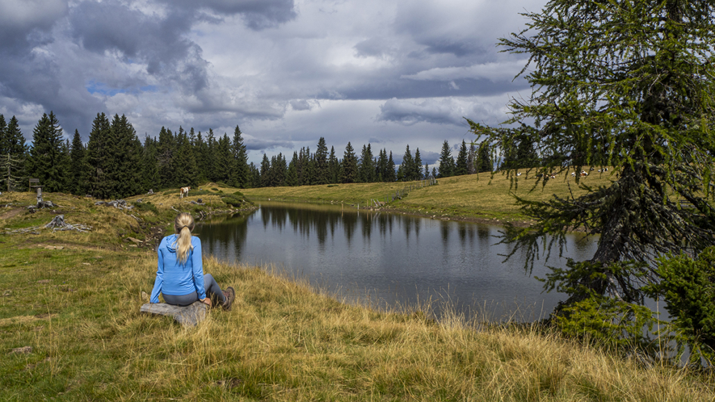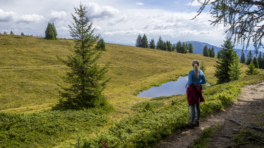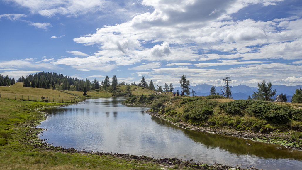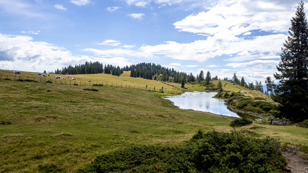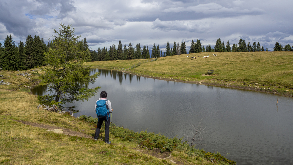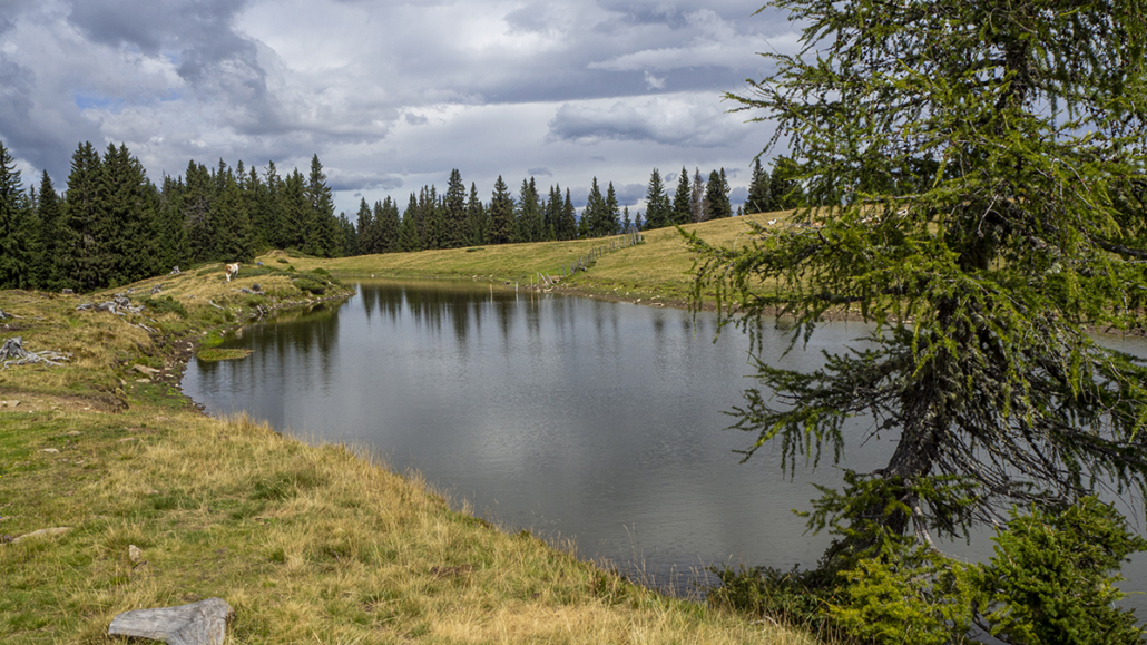Covid _19 ………21.08.2022. Eine einfache, aber landschaftlich lohnende Wanderung in den Kärntner Nockbergen bieten sich auf den Gipfel des Palnock an, wenngleich zu Beginn die Höhenmeter kräftig ansteigen. Beim kleinen Parkplatz beim Alpengasthaus Walder, noch ober Fresach am Amberg, beginnt die Rundwanderung. Die ersten 300 HM haben es schon in sich, erst bei Erreichen der obersten Waldlichtungen flacht das Gelände etwas ab. Ich bevorzuge die Rundwanderung im Uhrzeigersinn durchzuführen, weil das Gipfelziel „Palnock“ im Vordergrund steht und danach, immer auf schönen Wegen, der „Schwarzsee“ ein idyllischer Ort der Stille zum Verweilen einlädt. Ein Abstecher zur Schwarzseehütte ist sowieso ein „muss“ …. und nach einer Stärkung sind die 100 HM von der Hütte zum See etwas beschwerlich Der Abstieg erfolgt dann am AV-Weg Nr. 178, welcher durch dichten Wald und teilweise mit steingepflasterten Pfaden zurück zum Alpengasthaus Walder führt, zuletzt über den Fahrweg. Für das kostenlose Parken sollte eine Einkehr im urigen Gasthaus nicht fehlen. Daten: ca. 750 HM inkl. Auf und Ab, Wegstrecke ca. 9,5 KM in ca. 3,5 Stunden (ohne Pausen). Viel Spaß